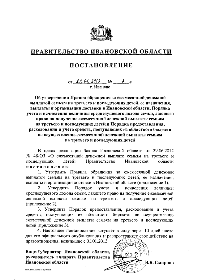 Постановление Правительства Ивановской области от 22.01.2013 N 8-п "Об утверждении Правил обращения за ежемесячной денежной выплатой семьям на третьего и последующих детей, ее назначения, выплаты и организации доставки в Ивановской области, Порядка учета и исчисления величины среднедушевого дохода семьи, дающего право на получение ежемесячной денежной выплаты семьям на третьего и последующих детей, и Порядка предоставления, расходования и учета средств, поступающих из областного бюджета на осуществление ежемесячной денежной выплаты семьям на третьего и последующих детей"