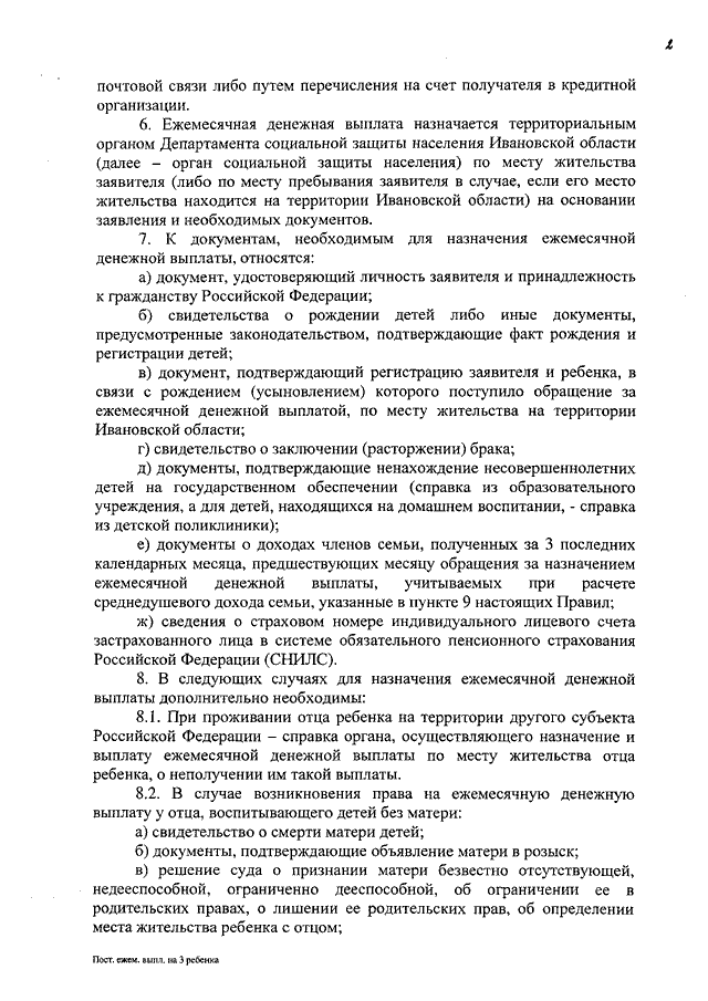 Постановление Правительства Ивановской области от 22.01.2013 N 8-п "Об утверждении Правил обращения за ежемесячной денежной выплатой семьям на третьего и последующих детей, ее назначения, выплаты и организации доставки в Ивановской области, Порядка учета и исчисления величины среднедушевого дохода семьи, дающего право на получение ежемесячной денежной выплаты семьям на третьего и последующих детей, и Порядка предоставления, расходования и учета средств, поступающих из областного бюджета на осуществление ежемесячной денежной выплаты семьям на третьего и последующих детей"