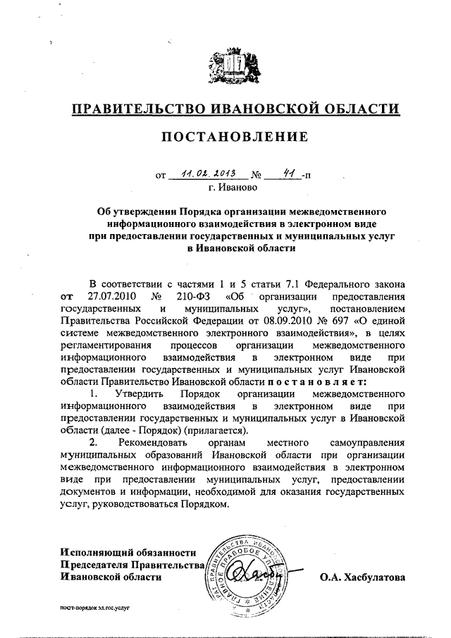Постановление Правительства Ивановской области от 11.02.2013 N 41-п "Об утверждении Порядка организации межведомственного информационного взаимодействия в электронном виде при предоставлении государственных и муниципальных услуг в Ивановской области"
