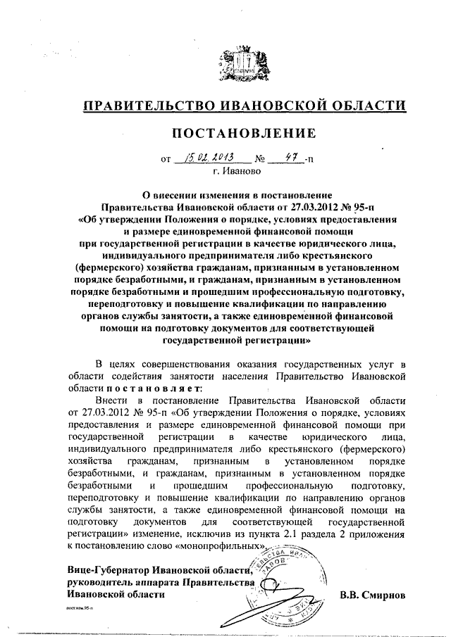 Постановление Правительства Ивановской области от 15.02.2013 N 47-п "О внесении изменения в постановление Правительства Ивановской области от 27.03.2012 N 95-п "Об утверждении Положения о порядке, условиях предоставления и размере единовременной финансовой помощи при государственной регистрации в качестве юридического лица, индивидуального предпринимателя либо крестьянского (фермерского) хозяйства гражданам, признанным в установленном порядке безработными, и гражданам, признанным в установленном порядке безработными и прошедшим профессиональную подготовку, переподготовку и повышение квалификации по направлению органов службы занятости, а также единовременной финансовой помощи на подготовку документов для соответствующей государственной регистрации"