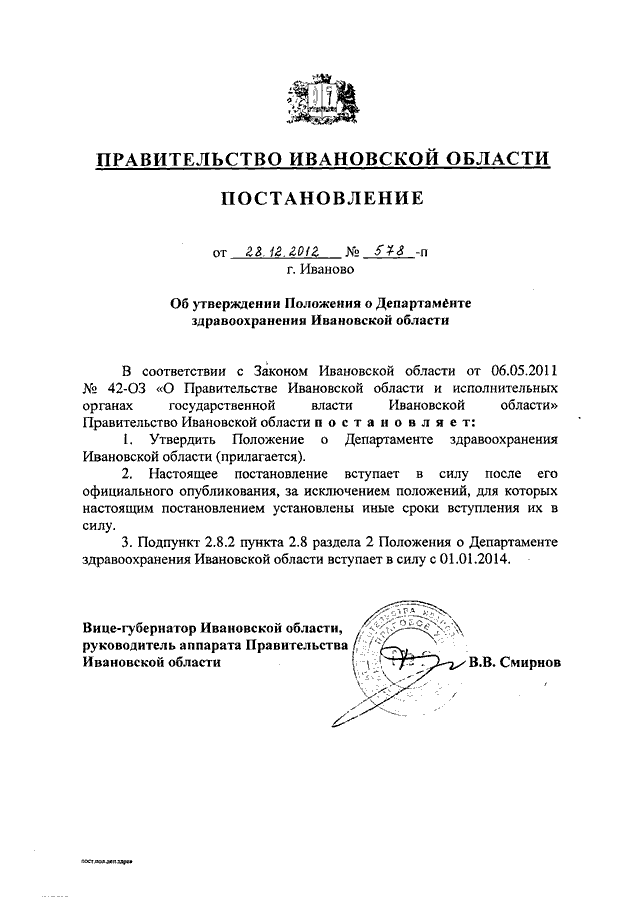 Постановление Правительства Ивановской области от 28.12.2012 N 578-п "Об утверждении Положения о Департаменте здравоохранения Ивановской области"