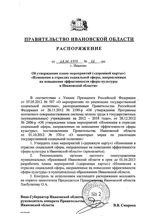 Распоряжение Правительства Ивановской области от 26.02.2013 N 32-рп "Об утверждении плана мероприятий ("дорожной карты") "Изменения в отраслях социальной сферы, направленные на повышение эффективности сферы культуры в Ивановской области"