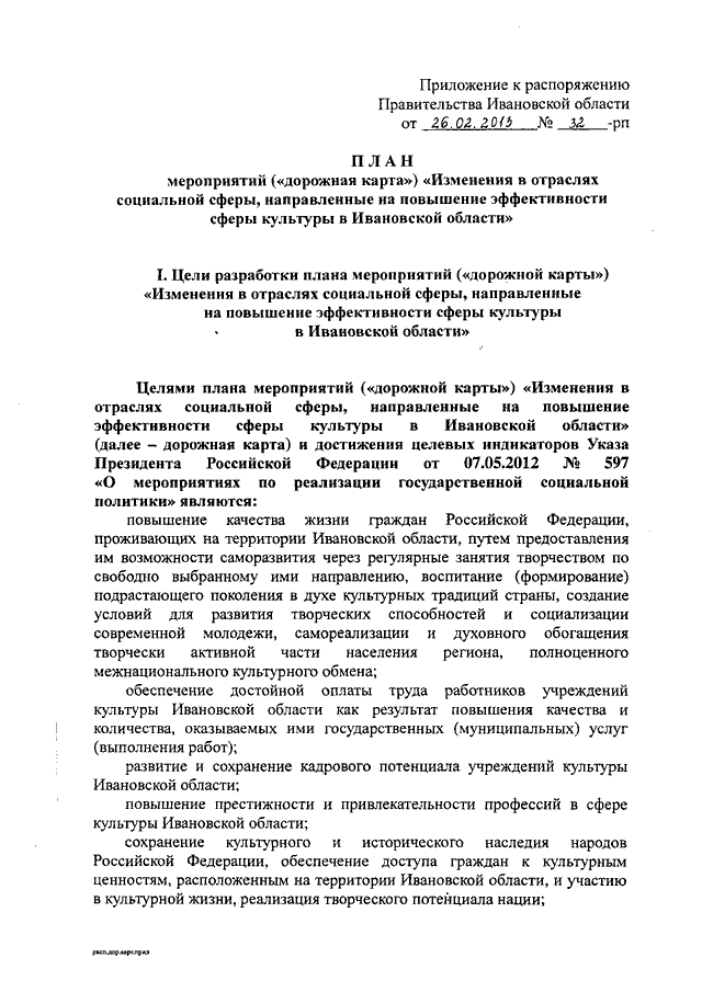 Распоряжение Правительства Ивановской области от 26.02.2013 N 32-рп "Об утверждении плана мероприятий ("дорожной карты") "Изменения в отраслях социальной сферы, направленные на повышение эффективности сферы культуры в Ивановской области"