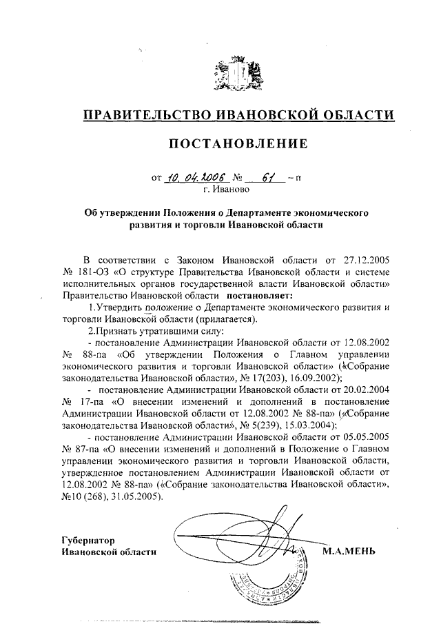 Постановление Правительства Ивановской области от 10.04.2006 N 61-п "Об утверждении Положения о Департаменте экономического развития и торговли Ивановской области"