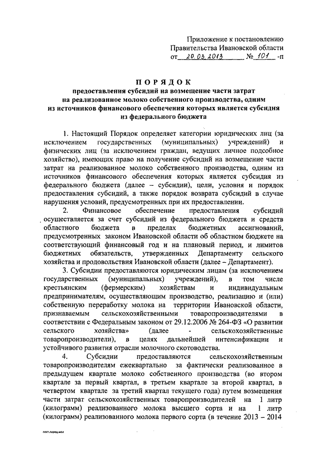 Постановление Правительства Ивановской области от 20.03.2013 N 101-п "Об утверждении Порядка предоставления субсидий на возмещение части затрат на реализованное молоко собственного производства, одним из источников финансового обеспечения которых является субсидия из федерального бюджета"