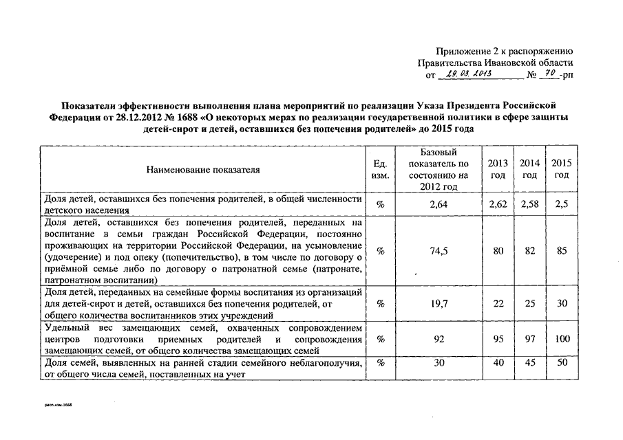 Распоряжение Правительства Ивановской области от 29.03.2013 N 70-рп "О мерах по реализации Указа Президента Российской Федерации от 28.12.2012 N 1688 "О некоторых мерах по реализации государственной политики в сфере защиты детей-сирот и детей, оставшихся без попечения родителей" (вместе с "Планом мероприятий по реализации Указа Президента Российской Федерации от 28.12.2012 N 1688 "О некоторых мерах по реализации государственной политики в сфере защиты детей-сирот и детей, оставшихся без попечения родителей")