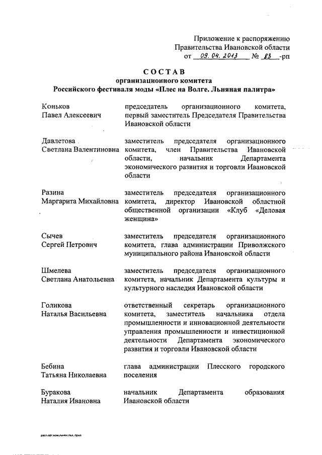 Распоряжение Правительства Ивановской области от 09.04.2013 N 83-рп "Об утверждении состава организационного комитета Российского фестиваля моды "Плес на Волге. Льняная палитра"