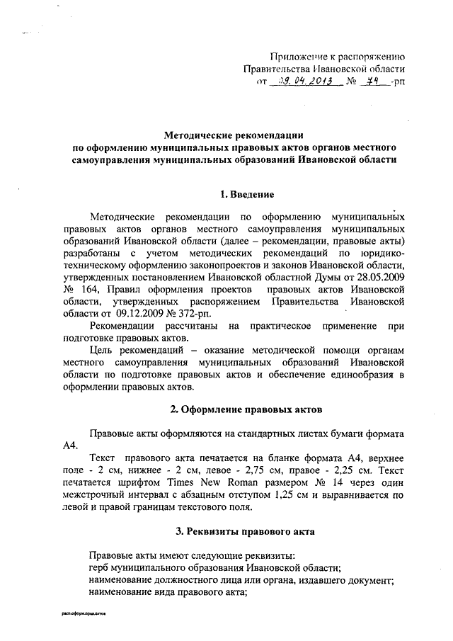 Распоряжение Правительства Ивановской области от 09.04.2013 N 74-рп "Об утверждении методических рекомендаций по оформлению муниципальных правовых актов органов местного самоуправления муниципальных образований Ивановской области"