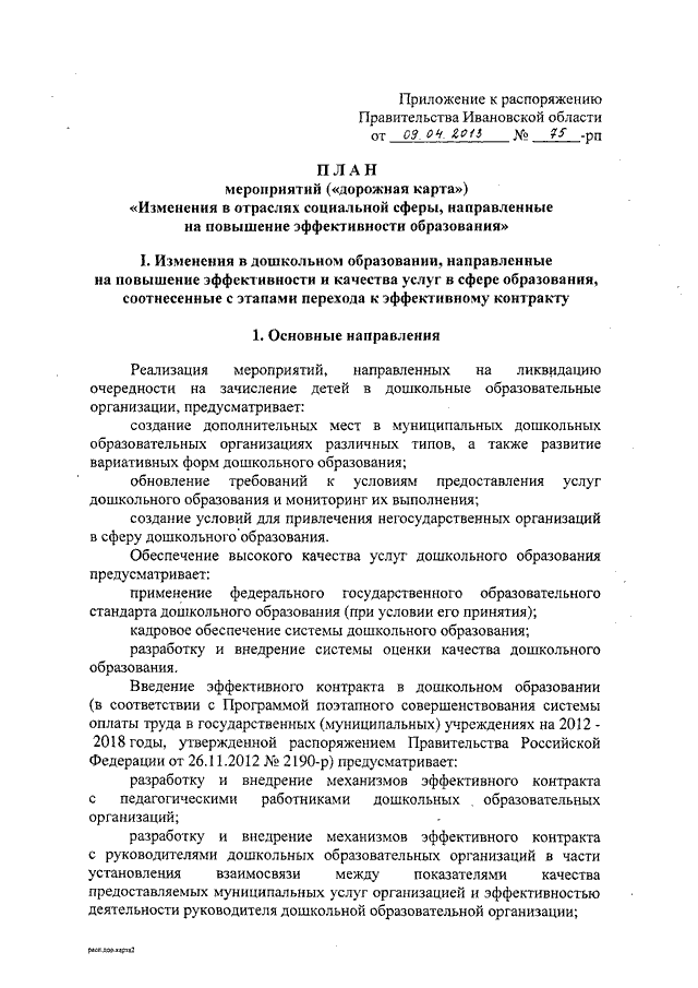 Распоряжение Правительства Ивановской области от 09.04.2013 N 75-рп "Об утверждении плана мероприятий ("дорожной карты") "Изменения в отраслях социальной сферы, направленные на повышение эффективности образования"