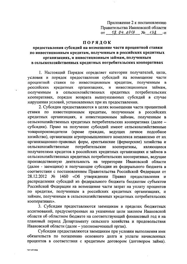 Постановление Правительства Ивановской области от 18.04.2013 N 138-п "Об утверждении порядков предоставления субсидий на возмещение части процентов по кредитам, полученным в российских кредитных организациях, и займам, полученным в сельскохозяйственных кредитных потребительских кооперативах, за счет средств областного бюджета" (вместе с "Порядком предоставления субсидий на возмещение части процентной ставки по краткосрочным (на срок до 1 года) кредитам, полученным в российских кредитных организациях, и займам, полученным в сельскохозяйственных кредитных потребительских кооперативах", "Порядком предоставления субсидий на возмещение части процентной ставки по инвестиционным кредитам, полученным в российских кредитных организациях, и инвестиционным займам, полученным в сельскохозяйственных кредитных потребительских кооперативах", "Порядком предоставления субсидий на возмещение части процентной ставки по долгосрочным, среднесрочным и краткосрочным кредитам (займам), взятым малыми формами хозяйствования")