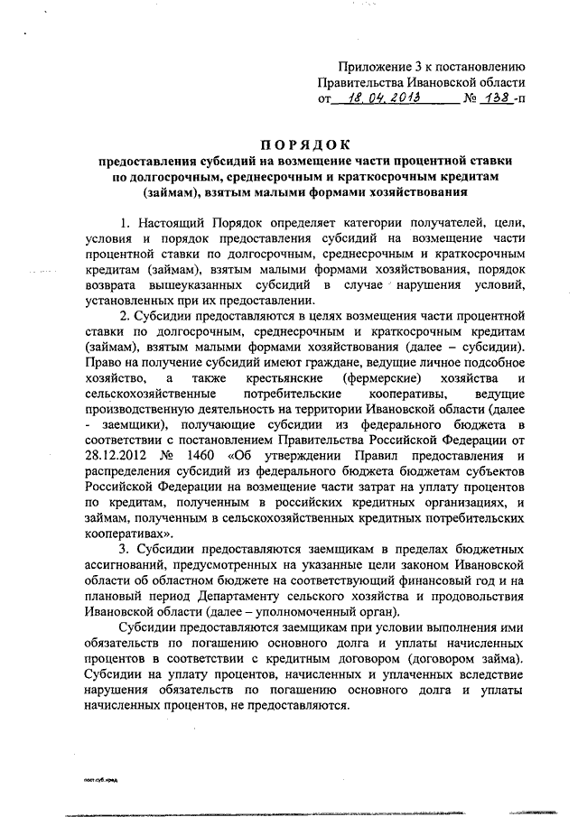 Постановление Правительства Ивановской области от 18.04.2013 N 138-п "Об утверждении порядков предоставления субсидий на возмещение части процентов по кредитам, полученным в российских кредитных организациях, и займам, полученным в сельскохозяйственных кредитных потребительских кооперативах, за счет средств областного бюджета" (вместе с "Порядком предоставления субсидий на возмещение части процентной ставки по краткосрочным (на срок до 1 года) кредитам, полученным в российских кредитных организациях, и займам, полученным в сельскохозяйственных кредитных потребительских кооперативах", "Порядком предоставления субсидий на возмещение части процентной ставки по инвестиционным кредитам, полученным в российских кредитных организациях, и инвестиционным займам, полученным в сельскохозяйственных кредитных потребительских кооперативах", "Порядком предоставления субсидий на возмещение части процентной ставки по долгосрочным, среднесрочным и краткосрочным кредитам (займам), взятым малыми формами хозяйствования")