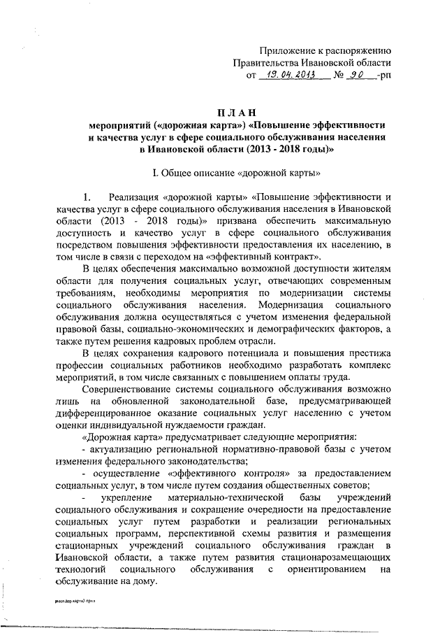 Распоряжение Правительства Ивановской области от 19.04.2013 N 90-рп "Об утверждении плана мероприятий ("дорожной карты") "Повышение эффективности и качества услуг в сфере социального обслуживания населения в Ивановской области (2013 - 2018 годы)"
