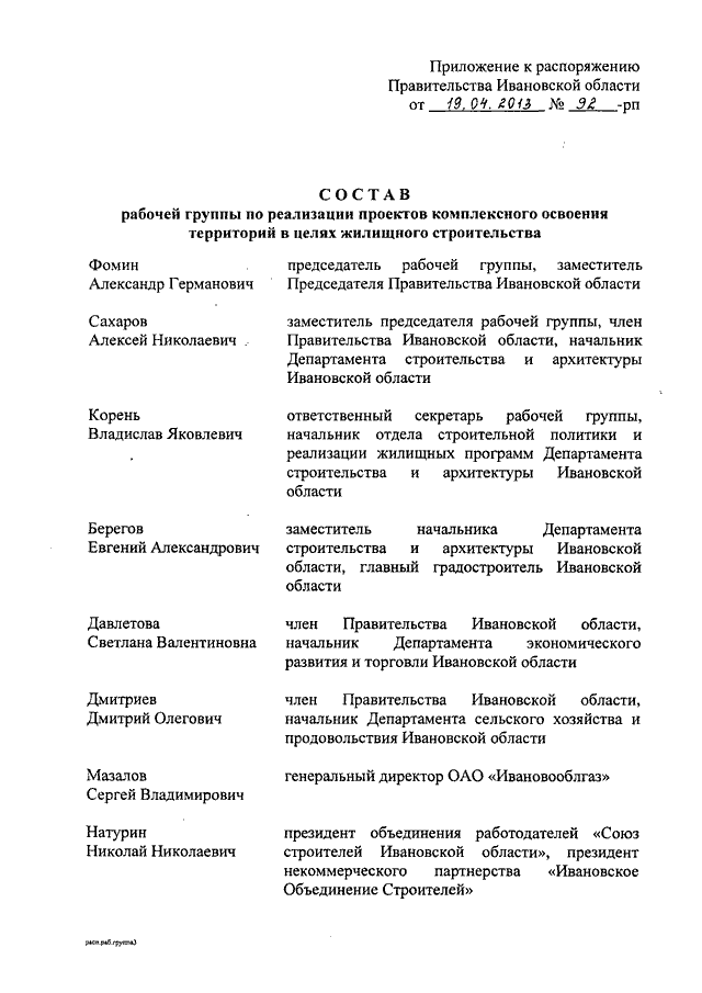 Распоряжение Правительства Ивановской области от 19.04.2013 N 92-рп "О создании рабочей группы по реализации проектов комплексного освоения территорий в целях жилищного строительства"