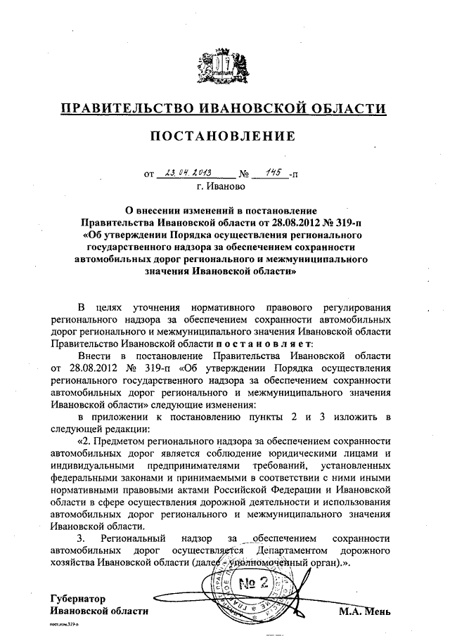 Постановление Правительства Ивановской области от 23.04.2013 N 145-п "О внесении изменений в постановление Правительства Ивановской области от 28.08.2012 N 319-п "Об утверждении Порядка осуществления регионального государственного надзора за обеспечением сохранности автомобильных дорог регионального и межмуниципального значения Ивановской области"
