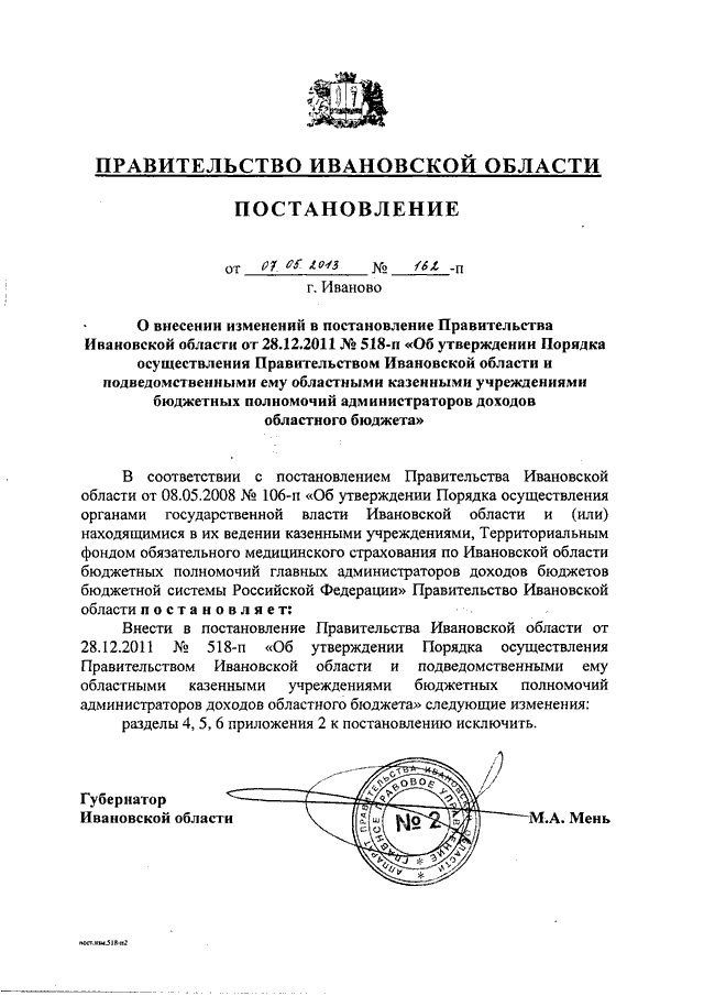 Постановление Правительства Ивановской области от 07.05.2013 N 162-п "О внесении изменений в постановление Правительства Ивановской области от 28.12.2011 N 518-п "Об утверждении Порядка осуществления Правительством Ивановской области и подведомственными ему областными казенными учреждениями бюджетных полномочий администраторов доходов областного бюджета"