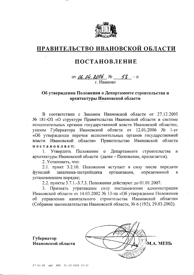 Постановление Правительства Ивановской области от 06.04.2006 N 58-п "Об утверждении Положения о Департаменте строительства и архитектуры Ивановской области"