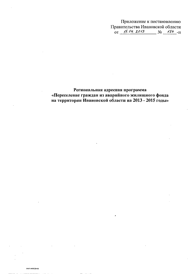 Постановление Правительства Ивановской области от 15.04.2013 N 134-п "Об утверждении региональной адресной программы "Переселение граждан из аварийного жилищного фонда на территории Ивановской области на 2013 - 2015 годы"
