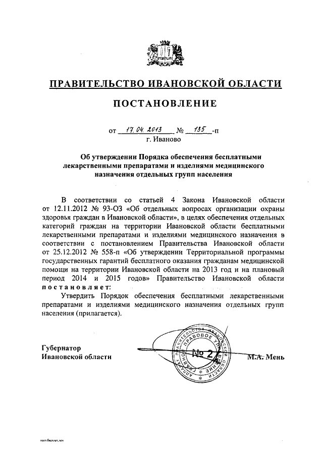 Постановление Правительства Ивановской области от 17.04.2013 N 135-п "Об утверждении Порядка обеспечения бесплатными лекарственными препаратами и изделиями медицинского назначения отдельных групп населения"