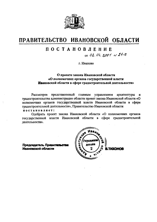 Постановление Правительства Ивановской области от 02.04.2001 N 21-п "О проекте закона Ивановской области "О полномочиях органов государственной власти Ивановской области в сфере градостроительной деятельности"