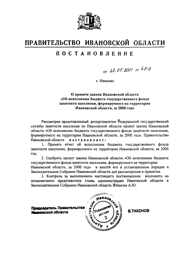 Постановление Правительства Ивановской области от 28.05.2001 N 45-п "О проекте закона Ивановской области "Об исполнении бюджета государственного фонда занятости населения, формируемого на территории Ивановской области, за 2000 год"