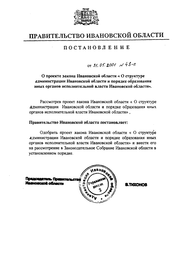Постановление Правительства Ивановской области от 31.05.2001 N 48-п "О проекте закона Ивановской области "О структуре администрации Ивановской области и порядке образования иных органов исполнительной власти Ивановской области"
