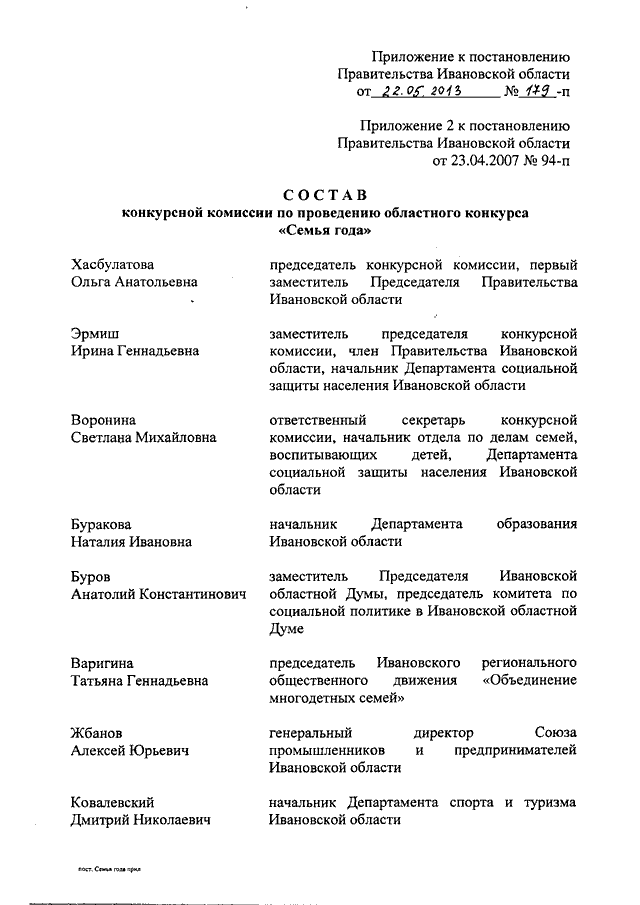 Постановление Правительства Ивановской области от 22.05.2013 N 179-п "О внесении изменения в постановление Правительства Ивановской области от 23.04.2007 N 94-п "О проведении областного конкурса "Семья года"