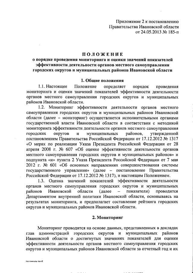 Постановление Правительства Ивановской области от 24.05.2013 N 185-п "Об оценке эффективности деятельности органов местного самоуправления городских округов и муниципальных районов Ивановской области" (вместе с "Положением о порядке проведения мониторинга и оценки значений показателей эффективности деятельности органов местного самоуправления городских округов и муниципальных районов Ивановской области", "Классификацией городских округов и муниципальных районов Ивановской области", "Перечнем исполнительных органов государственной власти Ивановской области, представляющих данные по показателям эффективности деятельности органов местного самоуправления городских округов и муниципальных районов Ивановской области для доклада глав администраций городских округов и муниципальных районов Ивановской области о достигнутых значениях показателей для оценки эффективности деятельности органов местного самоуправления городских округов и муниципальных районов Ивановской области за отчетный год и их планируемых значениях на 3-летний период")