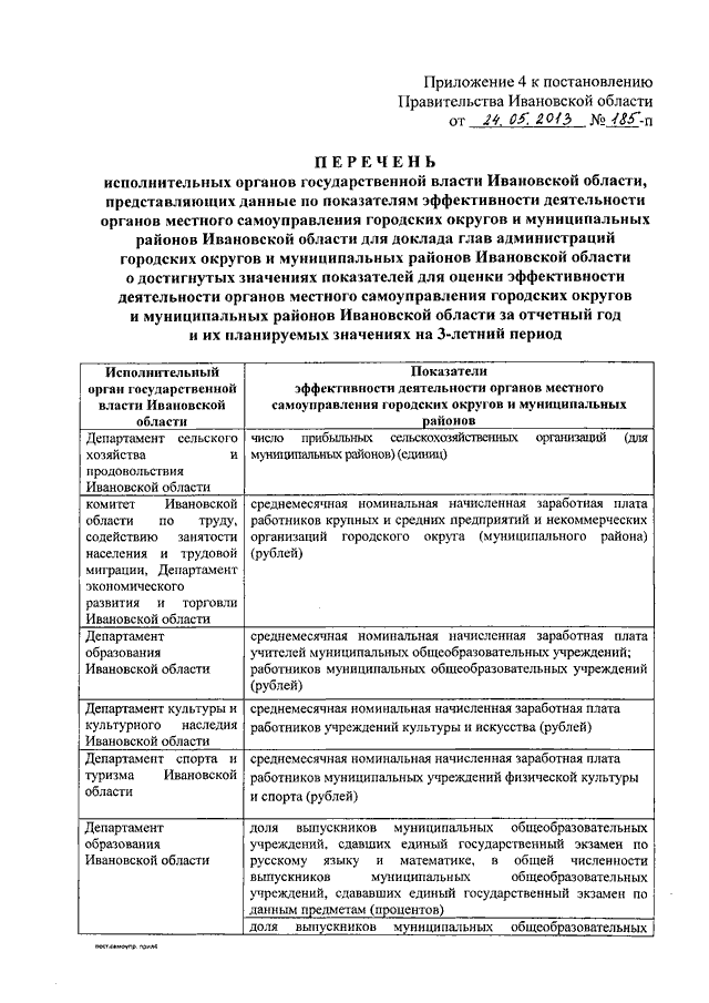 Постановление Правительства Ивановской области от 24.05.2013 N 185-п "Об оценке эффективности деятельности органов местного самоуправления городских округов и муниципальных районов Ивановской области" (вместе с "Положением о порядке проведения мониторинга и оценки значений показателей эффективности деятельности органов местного самоуправления городских округов и муниципальных районов Ивановской области", "Классификацией городских округов и муниципальных районов Ивановской области", "Перечнем исполнительных органов государственной власти Ивановской области, представляющих данные по показателям эффективности деятельности органов местного самоуправления городских округов и муниципальных районов Ивановской области для доклада глав администраций городских округов и муниципальных районов Ивановской области о достигнутых значениях показателей для оценки эффективности деятельности органов местного самоуправления городских округов и муниципальных районов Ивановской области за отчетный год и их планируемых значениях на 3-летний период")