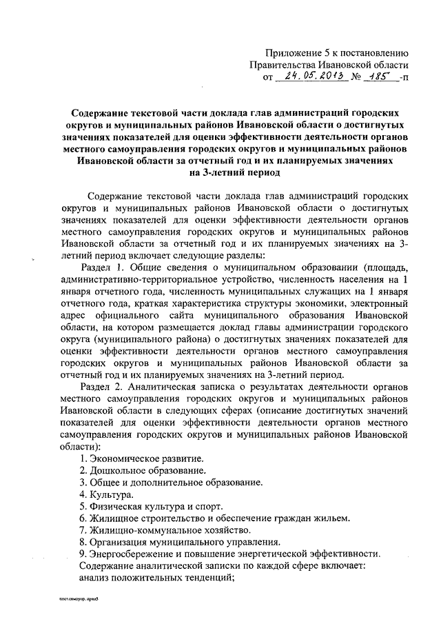 Постановление Правительства Ивановской области от 24.05.2013 N 185-п "Об оценке эффективности деятельности органов местного самоуправления городских округов и муниципальных районов Ивановской области" (вместе с "Положением о порядке проведения мониторинга и оценки значений показателей эффективности деятельности органов местного самоуправления городских округов и муниципальных районов Ивановской области", "Классификацией городских округов и муниципальных районов Ивановской области", "Перечнем исполнительных органов государственной власти Ивановской области, представляющих данные по показателям эффективности деятельности органов местного самоуправления городских округов и муниципальных районов Ивановской области для доклада глав администраций городских округов и муниципальных районов Ивановской области о достигнутых значениях показателей для оценки эффективности деятельности органов местного самоуправления городских округов и муниципальных районов Ивановской области за отчетный год и их планируемых значениях на 3-летний период")