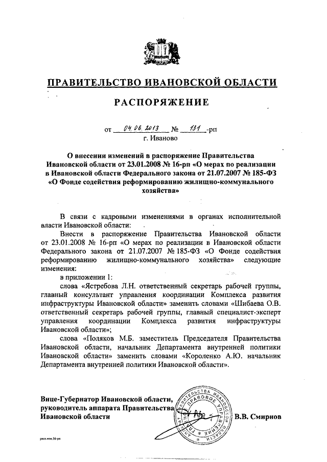 Распоряжение Правительства Ивановской области от 04.06.2013 N 131-рп "О внесении изменений в распоряжение Правительства Ивановской области от 23.01.2008 N 16-рп "О мерах по реализации в Ивановской области Федерального закона от 21.07.2007 N 185-ФЗ "О Фонде содействия реформированию жилищно-коммунального хозяйства"