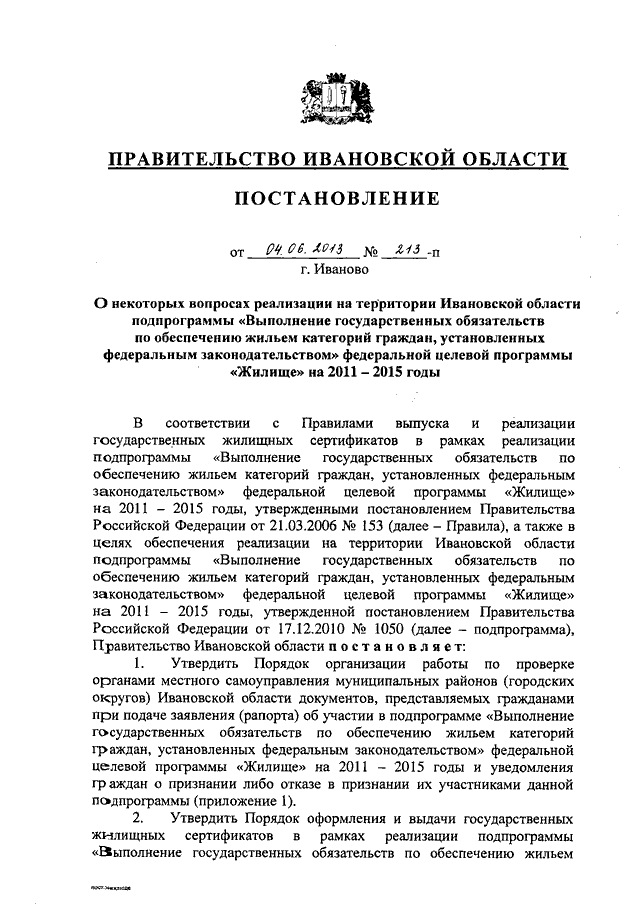 Постановление Правительства Ивановской области от 04.06.2013 N 213-п "О некоторых вопросах реализации на территории Ивановской области подпрограммы "Выполнение государственных обязательств по обеспечению жильем категорий граждан, установленных федеральным законодательством" федеральной целевой программы "Жилище" на 2011 - 2015 годы" (вместе с "Порядком организации работы по проверке органами местного самоуправления муниципальных районов (городских округов) Ивановской области документов, представляемых гражданами при подаче заявления (рапорта) об участии в подпрограмме "Выполнение государственных обязательств по обеспечению жильем категорий граждан, установленных федеральным законодательством" федеральной целевой программы "Жилище" на 2011 - 2015 годы, и уведомления граждан о признании либо отказе в признании их участниками данной подпрограммы", "Порядком оформления и выдачи государственных жилищных сертификатов в рамках реализации подпрограммы "Выполнение государственных обязательств по обеспечению жильем категорий граждан, установленных федеральным законодательством" федеральной целевой программы "Жилище" на 2011 - 2015 годы", "Порядком ведения реестра выданных государственных жилищных сертификатов в рамках реализации подпрограммы "Выполнение государственных обязательств по обеспечению жильем категорий граждан, установленных федеральным законодательством" федеральной целевой программы "Жилище" на 2011 - 2015 годы")