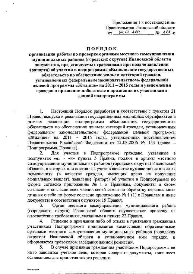 Постановление Правительства Ивановской области от 04.06.2013 N 213-п "О некоторых вопросах реализации на территории Ивановской области подпрограммы "Выполнение государственных обязательств по обеспечению жильем категорий граждан, установленных федеральным законодательством" федеральной целевой программы "Жилище" на 2011 - 2015 годы" (вместе с "Порядком организации работы по проверке органами местного самоуправления муниципальных районов (городских округов) Ивановской области документов, представляемых гражданами при подаче заявления (рапорта) об участии в подпрограмме "Выполнение государственных обязательств по обеспечению жильем категорий граждан, установленных федеральным законодательством" федеральной целевой программы "Жилище" на 2011 - 2015 годы, и уведомления граждан о признании либо отказе в признании их участниками данной подпрограммы", "Порядком оформления и выдачи государственных жилищных сертификатов в рамках реализации подпрограммы "Выполнение государственных обязательств по обеспечению жильем категорий граждан, установленных федеральным законодательством" федеральной целевой программы "Жилище" на 2011 - 2015 годы", "Порядком ведения реестра выданных государственных жилищных сертификатов в рамках реализации подпрограммы "Выполнение государственных обязательств по обеспечению жильем категорий граждан, установленных федеральным законодательством" федеральной целевой программы "Жилище" на 2011 - 2015 годы")