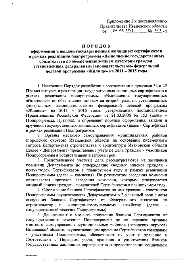 Постановление Правительства Ивановской области от 04.06.2013 N 213-п "О некоторых вопросах реализации на территории Ивановской области подпрограммы "Выполнение государственных обязательств по обеспечению жильем категорий граждан, установленных федеральным законодательством" федеральной целевой программы "Жилище" на 2011 - 2015 годы" (вместе с "Порядком организации работы по проверке органами местного самоуправления муниципальных районов (городских округов) Ивановской области документов, представляемых гражданами при подаче заявления (рапорта) об участии в подпрограмме "Выполнение государственных обязательств по обеспечению жильем категорий граждан, установленных федеральным законодательством" федеральной целевой программы "Жилище" на 2011 - 2015 годы, и уведомления граждан о признании либо отказе в признании их участниками данной подпрограммы", "Порядком оформления и выдачи государственных жилищных сертификатов в рамках реализации подпрограммы "Выполнение государственных обязательств по обеспечению жильем категорий граждан, установленных федеральным законодательством" федеральной целевой программы "Жилище" на 2011 - 2015 годы", "Порядком ведения реестра выданных государственных жилищных сертификатов в рамках реализации подпрограммы "Выполнение государственных обязательств по обеспечению жильем категорий граждан, установленных федеральным законодательством" федеральной целевой программы "Жилище" на 2011 - 2015 годы")