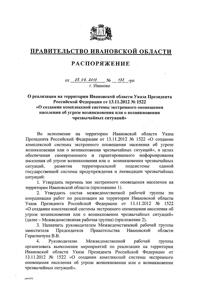 Распоряжение Правительства Ивановской области от 05.06.2013 N 133-рп "О реализации на территории Ивановской области Указа Президента Российской Федерации от 13.11.2012 N 1522 "О создании комплексной системы экстренного оповещения населения об угрозе возникновения или о возникновении чрезвычайных ситуаций" (вместе с "Перечнем зон экстренного оповещения населения на территории Ивановской области")