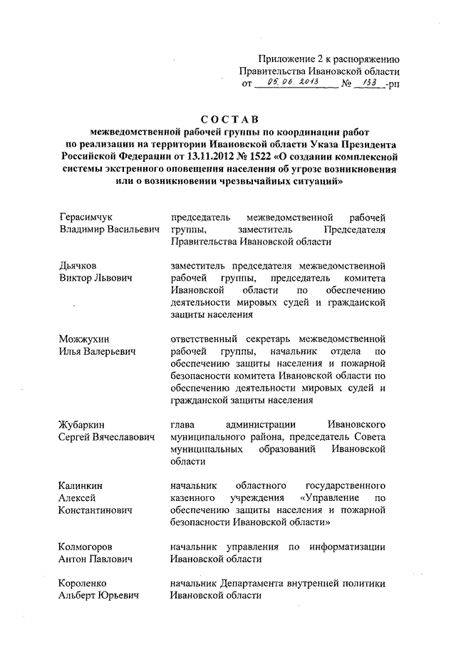 Распоряжение Правительства Ивановской области от 05.06.2013 N 133-рп "О реализации на территории Ивановской области Указа Президента Российской Федерации от 13.11.2012 N 1522 "О создании комплексной системы экстренного оповещения населения об угрозе возникновения или о возникновении чрезвычайных ситуаций" (вместе с "Перечнем зон экстренного оповещения населения на территории Ивановской области")