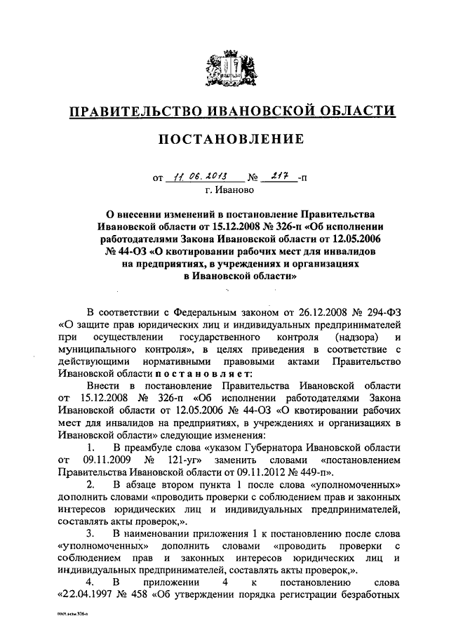 Постановление Правительства Ивановской области от 11.06.2013 N 217-п "О внесении изменений в постановление Правительства Ивановской области от 15.12.2008 N 326-п "Об исполнении работодателями Закона Ивановской области от 12.05.2006 N 44-ОЗ "О квотировании рабочих мест для инвалидов на предприятиях, в учреждениях и организациях в Ивановской области"