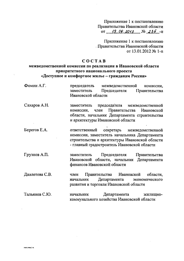 Постановление Правительства Ивановской области от 19.06.2013 N 236-п "О внесении изменений в постановление Правительства Ивановской области от 13.01.2012 N 1-п "О мерах по реализации в Ивановской области приоритетного национального проекта "Доступное и комфортное жилье - гражданам России" (вместе с "Положением о межведомственной комиссии по реализации в Ивановской области приоритетного национального проекта "Доступное и комфортное жилье - гражданам России")