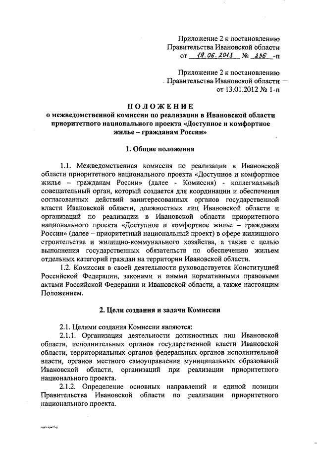 Постановление Правительства Ивановской области от 19.06.2013 N 236-п "О внесении изменений в постановление Правительства Ивановской области от 13.01.2012 N 1-п "О мерах по реализации в Ивановской области приоритетного национального проекта "Доступное и комфортное жилье - гражданам России" (вместе с "Положением о межведомственной комиссии по реализации в Ивановской области приоритетного национального проекта "Доступное и комфортное жилье - гражданам России")