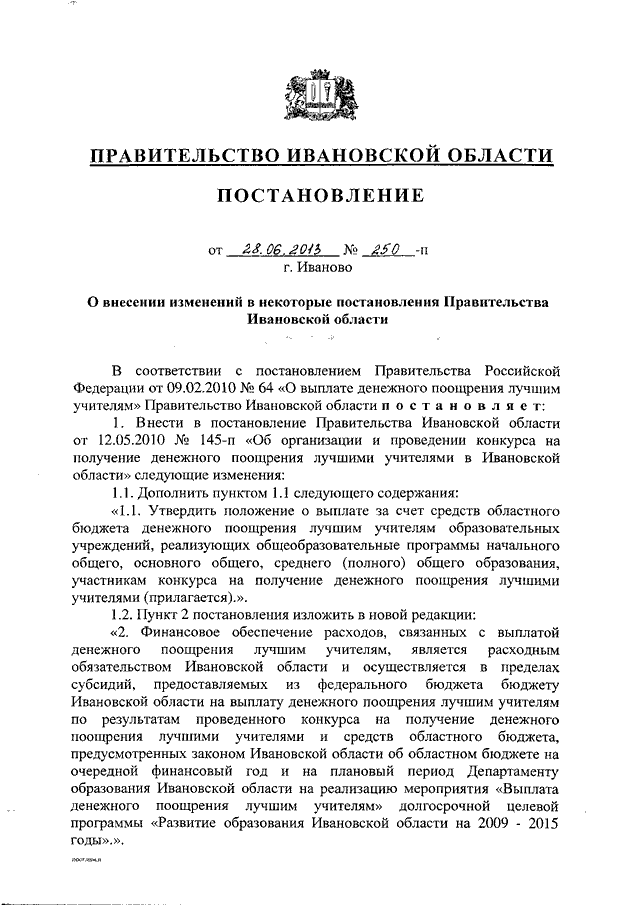 Постановление Правительства Ивановской области от 28.06.2013 N 250-п "О внесении изменений в некоторые постановления Правительства Ивановской области" (вместе с "Положением о выплате за счет средств областного бюджета денежного поощрения лучшим учителям образовательных учреждений, реализующих общеобразовательные программы начального общего, основного общего, среднего (полного) общего образования, участникам конкурса на получение денежного поощрения лучшими учителями")