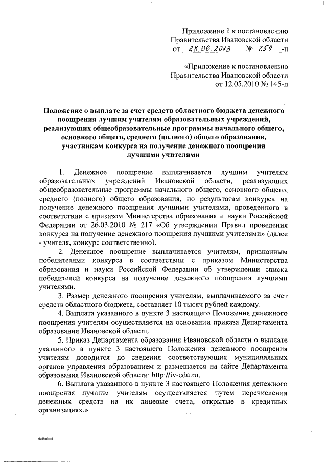 Постановление Правительства Ивановской области от 28.06.2013 N 250-п "О внесении изменений в некоторые постановления Правительства Ивановской области" (вместе с "Положением о выплате за счет средств областного бюджета денежного поощрения лучшим учителям образовательных учреждений, реализующих общеобразовательные программы начального общего, основного общего, среднего (полного) общего образования, участникам конкурса на получение денежного поощрения лучшими учителями")