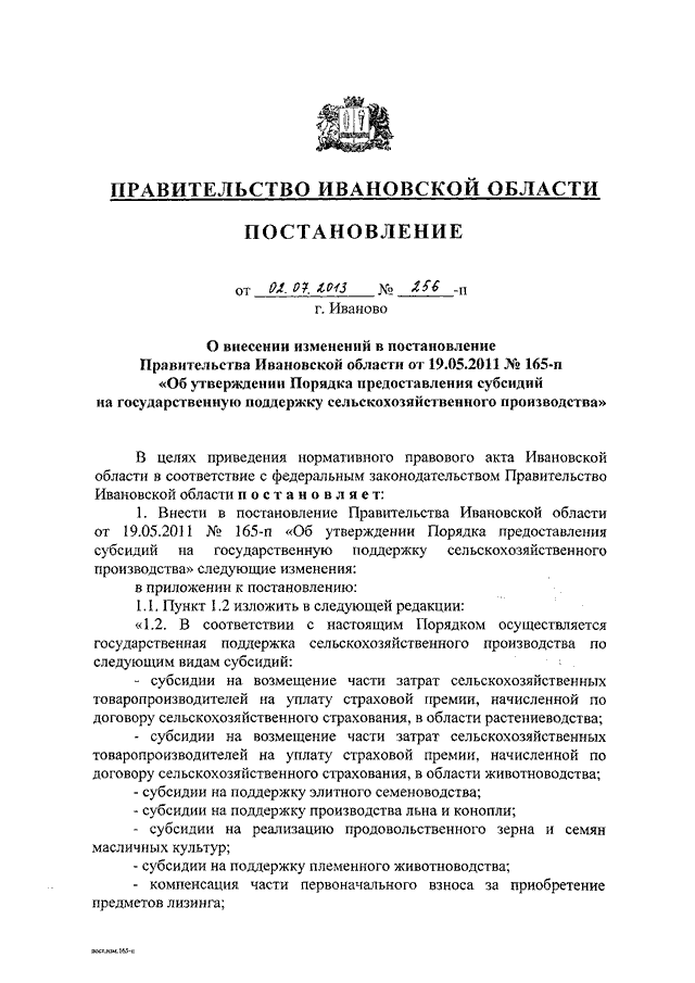 Постановление Правительства Ивановской области от 02.07.2013 N 256-п "О внесении изменений в постановление Правительства Ивановской области от 19.05.2011 N 165-п "Об утверждении Порядка предоставления субсидий на государственную поддержку сельскохозяйственного производства"