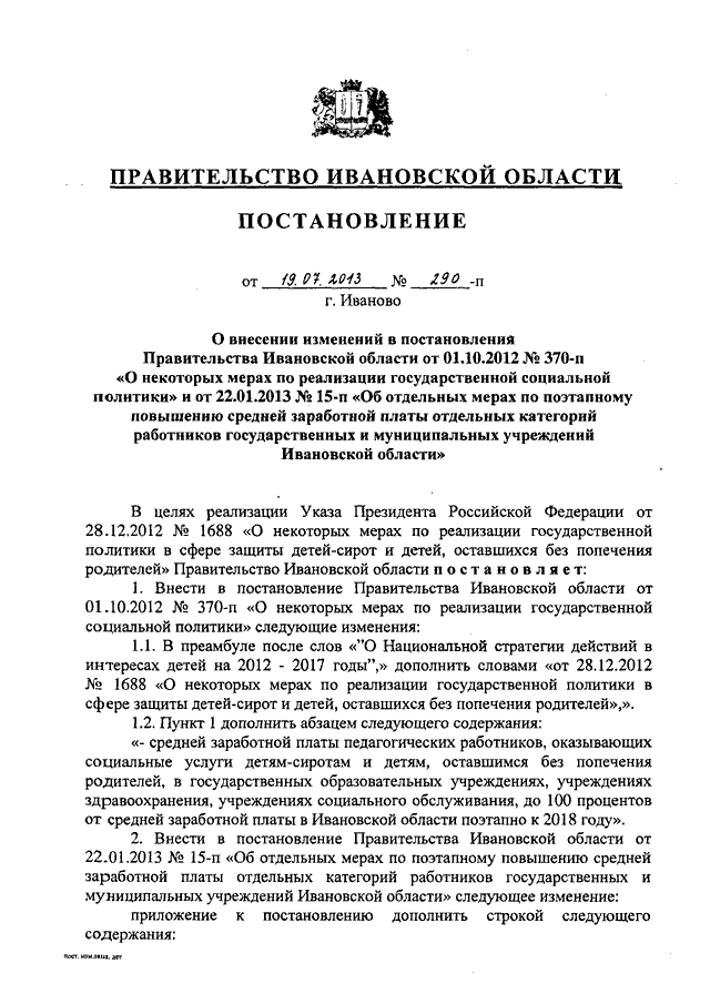 Постановление Правительства Ивановской области от 19.07.2013 N 290-п "О внесении изменений в постановления Правительства Ивановской области от 01.10.2012 N 370-п "О некоторых мерах по реализации государственной социальной политики" и от 22.01.2013 N 15-п "Об отдельных мерах по поэтапному повышению средней заработной платы отдельных категорий работников государственных и муниципальных учреждений Ивановской области"