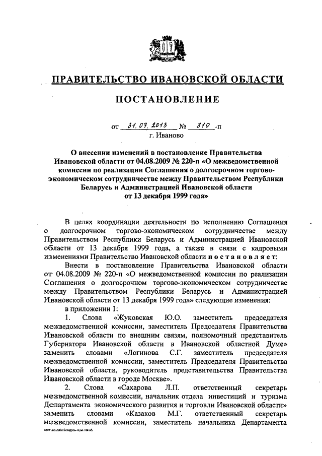 Постановление Правительства Ивановской области от 31.07.2013 N 310-п "О внесении изменений в постановление Правительства Ивановской области от 04.08.2009 N 220-п "О межведомственной комиссии по реализации Соглашения о долгосрочном торгово-экономическом сотрудничестве между Правительством Республики Беларусь и Администрацией Ивановской области от 13 декабря 1999 года"