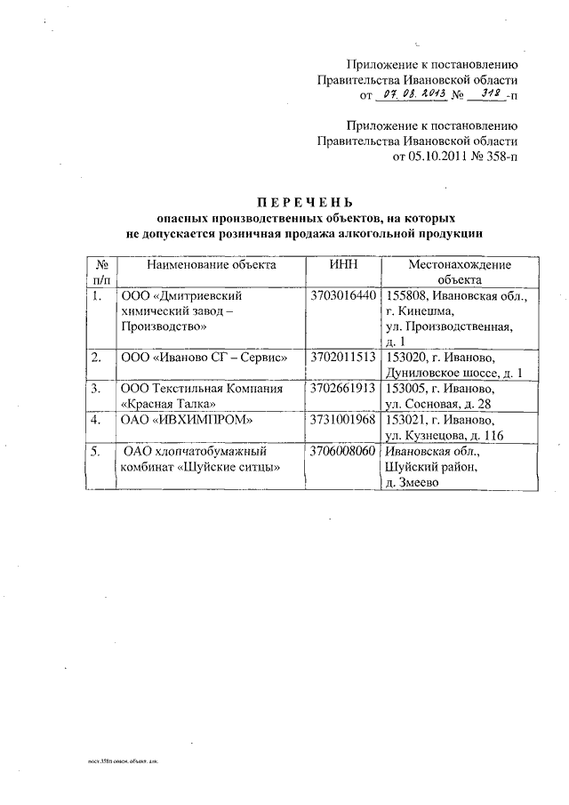 Постановление Правительства Ивановской области от 07.08.2013 N 318-п "О внесении изменений в постановление Правительства Ивановской области от 05.10.2011 N 358-п "Об установлении дополнительных ограничений мест розничной продажи алкогольной продукции на территории Ивановской области" (вместе с "Перечнем опасных производственных объектов, на которых не допускается розничная продажа алкогольной продукции")