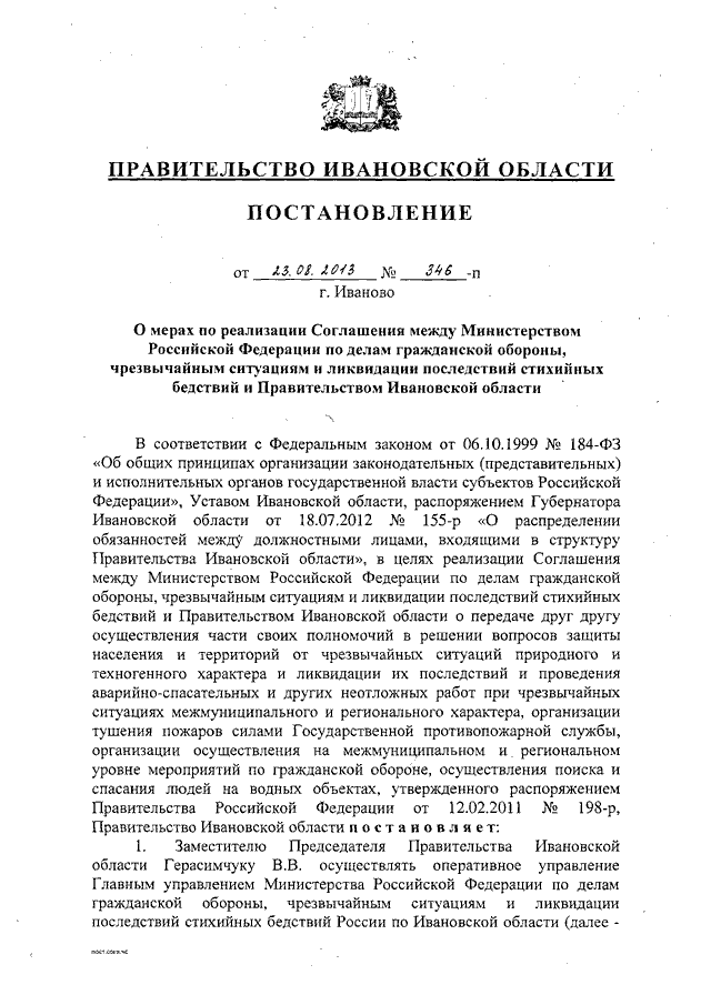Постановление Правительства Ивановской области от 23.08.2013 N 346-п "О мерах по реализации Соглашения между Министерством Российской Федерации по делам гражданской обороны, чрезвычайным ситуациям и ликвидации последствий стихийных бедствий и Правительством Ивановской области"