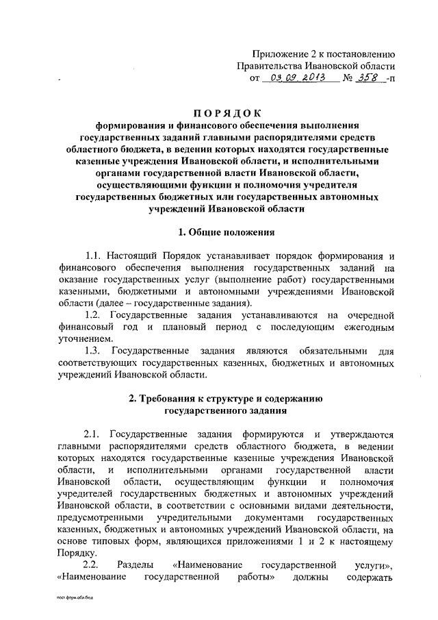 Постановление Правительства Ивановской области от 03.09.2013 N 358-п "О переходе к формированию областного бюджета на основе государственных программ Ивановской области" (вместе с "Порядком разработки, реализации и оценки эффективности государственных программ Ивановской области", "Порядком формирования и финансового обеспечения выполнения государственных заданий главными распорядителями средств областного бюджета, в ведении которых находятся государственные казенные учреждения Ивановской области, и исполнительными органами государственной власти Ивановской области, осуществляющими функции и полномочия учредителя государственных бюджетных или государственных автономных учреждений Ивановской области", "Порядком составления проекта областного бюджета на очередной финансовый год и плановый период")