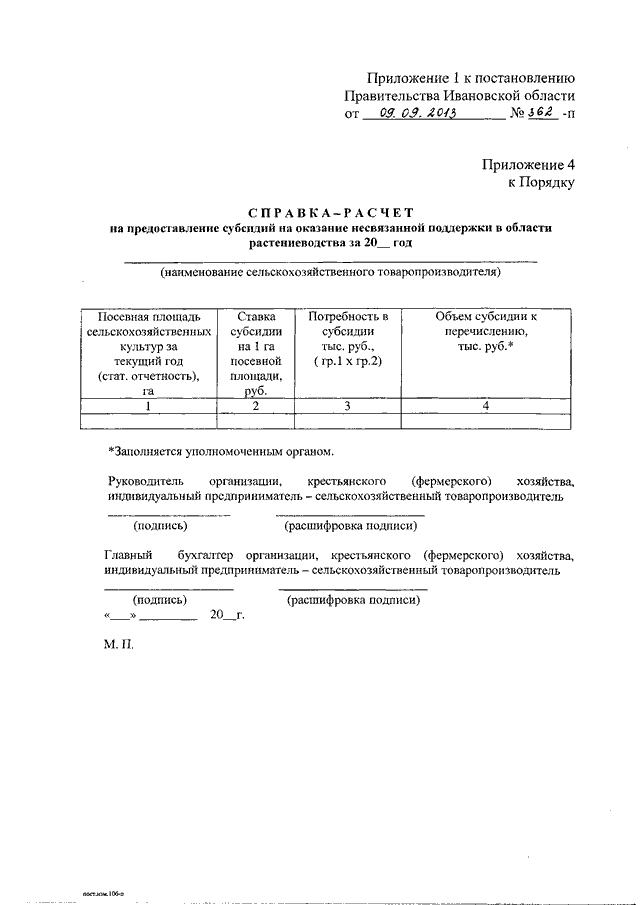 Постановление Правительства Ивановской области от 09.09.2013 N 362-п "О внесении изменений в постановление Правительства Ивановской области от 20.03.2013 N 106-п "Об утверждении Порядка предоставления субсидий на оказание несвязанной поддержки сельскохозяйственным товаропроизводителям в области растениеводства"