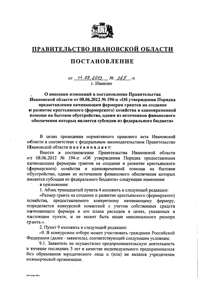Постановление Правительства Ивановской области от 11.09.2013 N 365-п "О внесении изменений в постановление Правительства Ивановской области от 08.06.2012 N 194-п "Об утверждении Порядка предоставления начинающим фермерам грантов на создание и развитие крестьянского (фермерского) хозяйства и единовременной помощи на бытовое обустройство, одним из источников финансового обеспечения которых является субсидия из федерального бюджета"