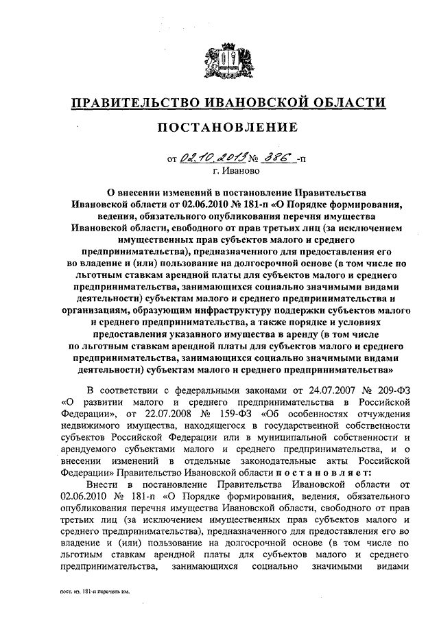 Постановление Правительства Ивановской области от 02.10.2013 N 386-п "О внесении изменений в постановление Правительства Ивановской области от 02.06.2010 N 181-п "О Порядке формирования, ведения, обязательного опубликования перечня имущества Ивановской области, свободного от прав третьих лиц (за исключением имущественных прав субъектов малого и среднего предпринимательства), предназначенного для предоставления его во владение и (или) пользование на долгосрочной основе (в том числе по льготным ставкам арендной платы для субъектов малого и среднего предпринимательства, занимающихся социально значимыми видами деятельности) субъектам малого и среднего предпринимательства и организациям, образующим инфраструктуру поддержки субъектов малого и среднего предпринимательства, а также порядке и условиях предоставления указанного имущества в аренду (в том числе по льготным ставкам арендной платы для субъектов малого и среднего предпринимательства, занимающихся социально значимыми видами деятельности) субъектам малого и среднего предпринимательства"