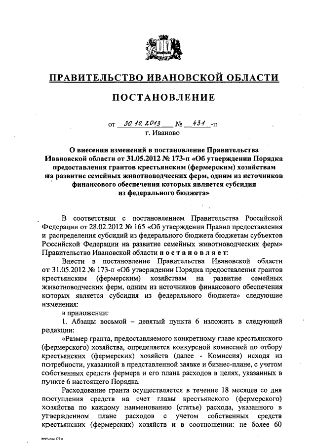 Постановление Правительства Ивановской области от 30.10.2013 N 431-п "О внесении изменений в постановление Правительства Ивановской области от 31.05.2012 N 173-п "Об утверждении Порядка предоставления грантов крестьянским (фермерским) хозяйствам на развитие семейных животноводческих ферм, одним из источников финансового обеспечения которых является субсидия из федерального бюджета"